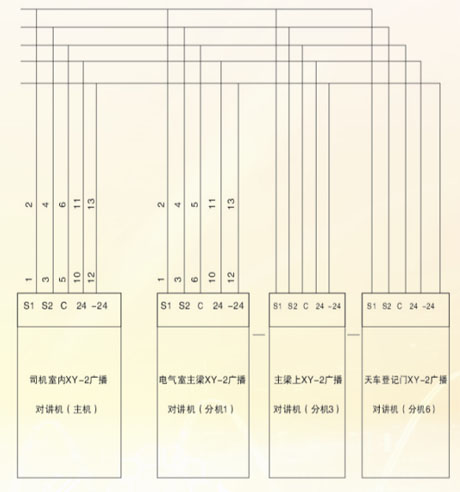 XY―2型系列產(chǎn)品廣泛應(yīng)用于冶金、電力等行業(yè)的有線對(duì)講系統(tǒng),在天車上其主站安裝在司機(jī)室,分站可以分布在電力室內(nèi)、高壓室、大小車上和天車登機(jī)門。該系統(tǒng)由若干臺(tái)廣播對(duì)講機(jī)組成一個(gè)機(jī)內(nèi)通訊網(wǎng)絡(luò),各個(gè)有線廣播站內(nèi)置揚(yáng)聲器和送受話器,任何一個(gè)廣播站喊話,其余話站均能接通廣播。可以使生產(chǎn)人員方便地與天車操作人員取得聯(lián)系。在各個(gè)站操作時(shí)無(wú)需撥號(hào),可以方便的實(shí)現(xiàn)一對(duì)一講話,各話站并列接線,用戶可根據(jù)工藝要求任意擴(kuò)充,每個(gè)話站都是一個(gè)獨(dú)特的系統(tǒng),任一臺(tái)損壞,不會(huì)影響其余分站正常工作。在起重設(shè)備上可以方便地實(shí)現(xiàn)上下車聯(lián)系,機(jī)內(nèi)操作人員相互通訊。接線原理框圖參見附錄。