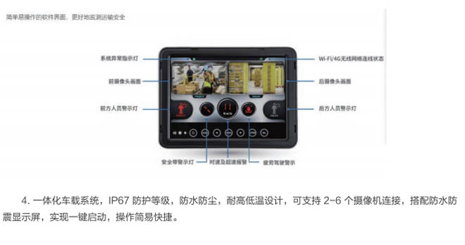 4.智能集成化設(shè)計,一鍵開啟車載系統(tǒng),AI精準(zhǔn)識別、人車防撞、車車防撞、盲區(qū)防撞等。