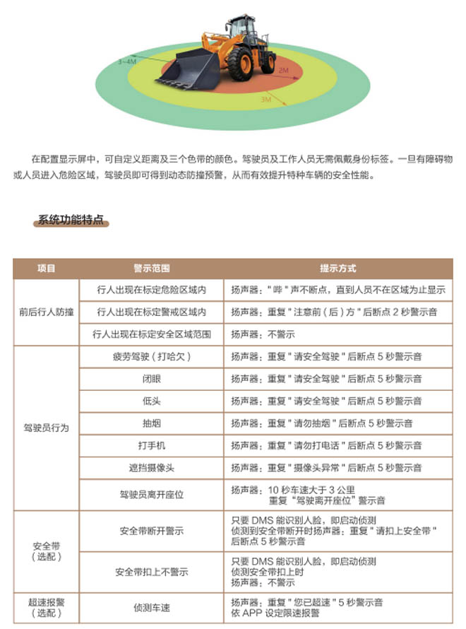 特種車輛智能識別防撞預(yù)警系統(tǒng)是專為工程車輛叉車、裝載機(jī)、挖掘機(jī)、推土機(jī)、礦山港口移動車輛設(shè)備所設(shè)計的智能識別防撞預(yù)警安全裝置,能夠?qū)崟r偵測工作區(qū)域的危險狀態(tài)并提供警示,有助于提升預(yù)防工程特種車輛作業(yè)安全。一旦有障礙物或人員進(jìn)入危險區(qū)域,駕駛員可得到動態(tài)防撞預(yù)警并發(fā)出報警進(jìn)行實時減速或停車,該系統(tǒng)能在各種復(fù)雜廠區(qū)路況及工礦環(huán)境中幫助駕駛員避免危險,預(yù)防事故發(fā)生減輕壓力,提供豐富的駕駛員輔助環(huán)境感知等功能
